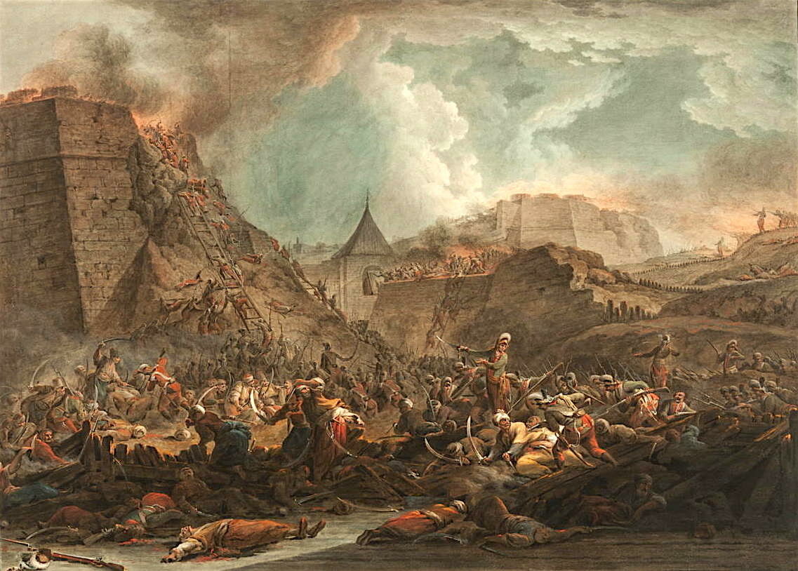 В январе 1788 г. в войну вступила Австрия. В то же время в июне 1788 г. началась война России со Швецией. Первыми начали кампанию 1788 г. австрийцы, которые весной осадили турецкую крепость Хотин на Днестре. Однако осада шла неудачно. В июле фельдмаршал Румянцев перешел с войсками Днестр и послал в помощь австрийцам корпус генерала Салтыкова. 4 сентября 1788 г. хотинский гарнизон, так и не дождавшись подкреплений, капитулировал. К зиме Румянцев занял северную часть Молдавии и расположил свою армию в районе Яссы-Кишинев. Главные события кампании 1788 г. развернулись вокруг крепости Очаков, которую в июле осадила 80-тысячная армия фельдмаршала Потемкина. Потемкин вел пассивную осаду, которая затянулась на 5 месяцев. Эта пассивность дорого обошлась осаждавшим. С наступлением холодов гибель солдат только от морозов стала составлять ежедневно 40–50 человек. Это подтолкнуло Потемкина к активным действиям. 6 декабря он предпринял штурм, который завершился взятием Очакова — последнего мощного турецкого форпоста в Северном Причерноморье. Кампания 1788 г. также ознаменовалась первой крупной победой Черноморского флота. 3 июля у острова Фидониси (ныне Змеиный) русская эскадра под командованием контр-адмирала М.И. Войновича одержала верх над турецким флотом Хасан-паши, которому пришлось отступить, отказавшись от помощи гарнизону Очакова.